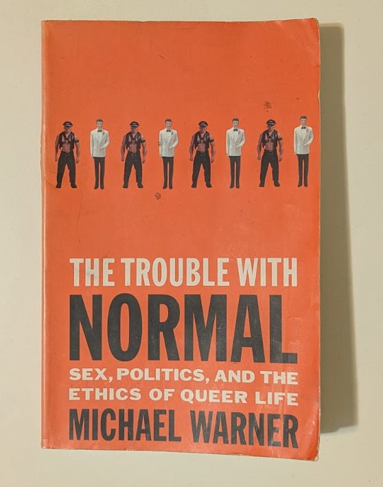 Warner disdains gay “identitarianism” and exalts “queer politics” over it – but he’s obviously attached to the idea of gay male community. I don’t think he wants to trade the stuffy normal gay guys for ideologically-aligned fag hags and spicy straights. He refuses to say some gay men aren’t queer, even though that would vastly clarify his arguments, because that way he can keep the whole gang together under a more fashionable label. It’s a label that he controls because he is a professor of queer theory.